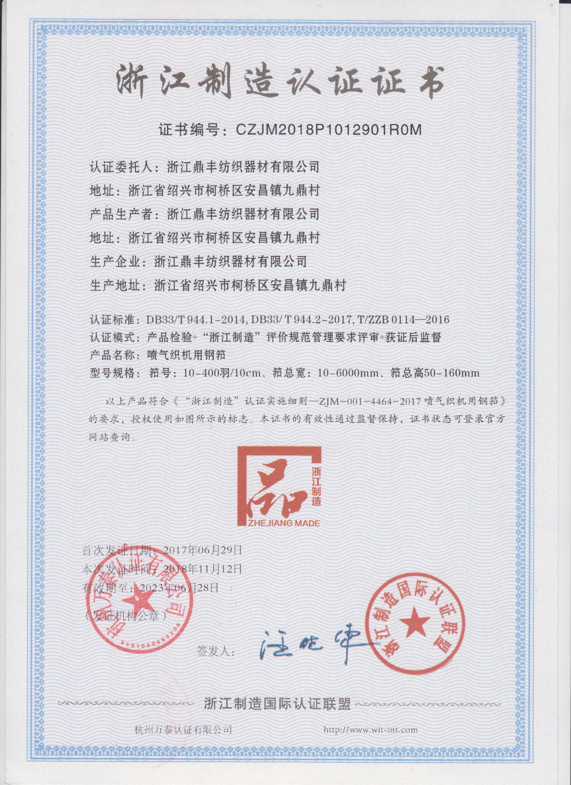 浙江鼎丰纺织器材有限公司始建于1986年,是一家专业生产各类无梭织机用钢筘:喷气筘、喷水筘、剑杆筘、其他类型钢筘;铝合金综框、钢片综、停经片、经轴、织轴、卷布辊等产品及配件的民营企业。